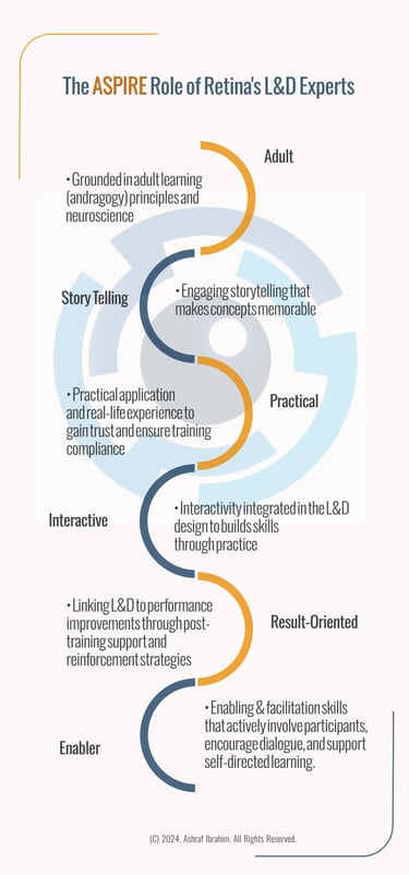 ASPIRE is our proprietary methodology for creating learning experiences that drive measurable behavior change and performance improvement. It integrates six critical elements that address how adults actually learn, retain, and apply new skills—elements that most training programs miss entirely.